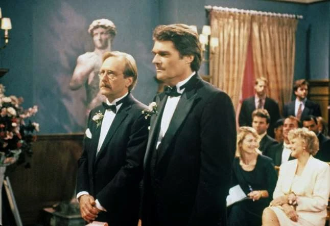 Scott and Leon have trouble planning their wedding until Roseanne offers to plan it for free. This includes dealing with Leon's cold feet/self-doubt about his sexuality. Roseanne helps the two "lovebirds" prepare for their marriage. Norm Crosby appears as Reverend Crosby, and June Lockhart of "Lost In Space" TV series fame also makes a guest appearance as Mrs. Carp, Leon's mother.